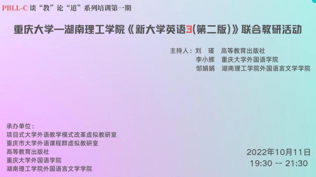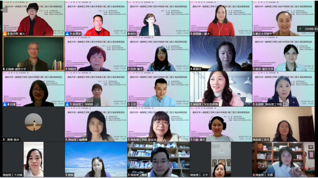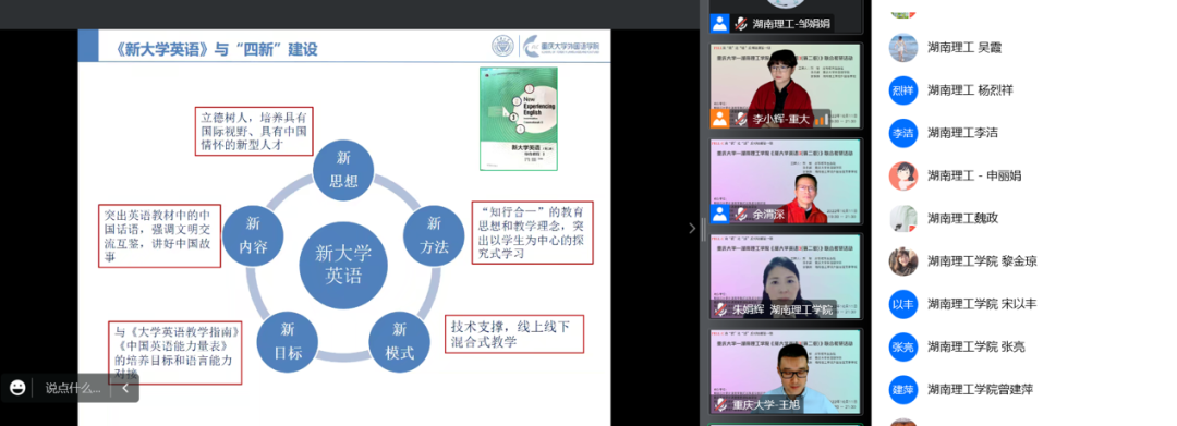 校园网讯10月11日晚7:30,由教育部项目式大学英语教学模式改革虚拟教研室、高等教育出版社、重庆大学大学外语教育中心和365英国上市集团依托《新大学英语综合教程3第二版》举行了联合教研活动。本次活动目的在于更好地理解和使用教材,促进大学英语教学改革,提高教学质量。这是365英国上市集团首次通过腾讯会议,与其他高校同行展开联合教研交流。该活动也得到了高教社的高度重视,面向全国高校全网直播。