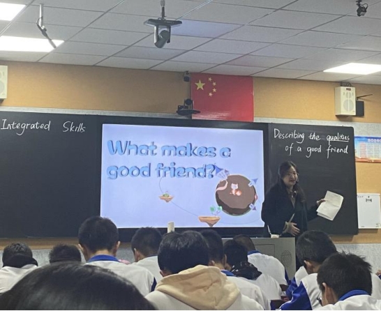 康琪代表十五中实习组21名同学在多媒体录播室给高一年级451班授课,教学内容为译林版必修一教材"Unit 3 Getting along with others" integrated skills。