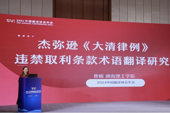 3月30日下午,曹晴老师有幸与中国政法大学张清教授、张法连教授和广东外语外贸大学赵军峰教授共同参与“培养高端法律翻译人才,讲好中国法治故事”分论坛,并做了题为“杰弥逊《大清律例》违禁取利条款术语翻译研究”的报告。