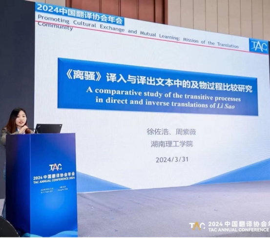 3月31日下午,徐佐浩老师和硕士生周紫薇共同参与了“中国文化对外翻译与传播——传统与现代”分论坛,指导硕士生周紫薇做了“《离骚》译入与译出文本中的及物过程比较研究”的报告。