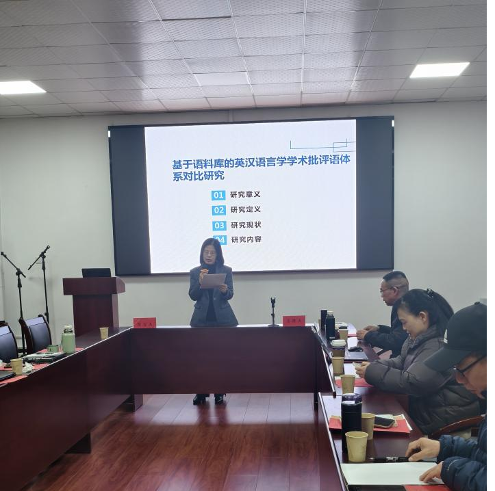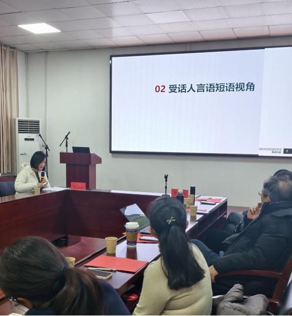 研讨会第二部分由欧阳建平教授主持,包括四场科研课题报告。彭寒珂老师探讨了语料库数据驱动的英汉学术批评话语体系,谢洁副教授在批评性思维视域下探讨了大学英语听力教学模式,李香副教授从句法视角探讨了汉语句末助词的言语行为,杨稼辉副教授基于事件语义学探讨了汉语时间指称。四场报告议题广泛,内涵丰富,反映出公司语言学研究团队不断开拓创新的积极风貌。