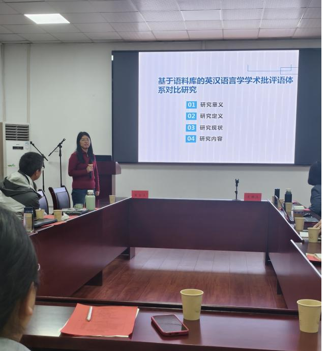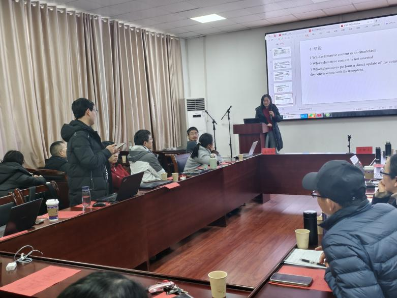 会议由两个部分组成,分别是学术论文报告和科研课题报告。第一部分由湛朝虎副教授主持,公司两位优秀青年学者魏政博士和黄珊博士分别探讨了汉语祈使句的情态词分析和感叹言语行为的话语分析,展示了他们在这两个重要形式语义学前沿议题中的最新研究成果。