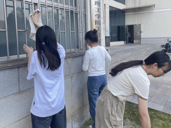 在劳动过程中,员工们带着自发准备的劳动工具,按照分配好的任务有序进行,积极投身于劳动教育活动中。员工们团结一致、分工合作,认真打扫地面、清理草丛、擦拭窗户。经过员工们细致的打扫清理,新学工办办公室的环境变得更加干净整洁。