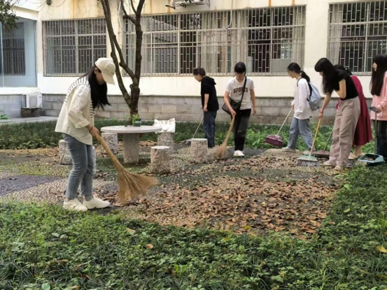 当日下午两点,成员们便齐聚在8栋教学楼前,开始了义务劳动实践活动。他们分工明确,各司其职,一部分人负责打扫大厅,另一部分人则负责清扫落叶,还有人负责拖地。他们手持工具,仔细清理了每一个角落。经过他们的辛勤劳动, 8栋教学楼焕然一新,大厅宽敞明亮,教室干净整洁,为师生们营造了一个舒适、宜人的学习环境。