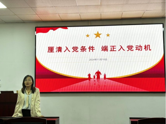 围绕本次培训的主题“厘清入党条件,端正入党动机”,周伟芳首先阐明了入党需具备的条件。她强调,申请入党者必须年满十八岁,具备中国国籍,承认党的纲领和章程,愿意参加党的一个组织并在其中积极工作,执行党的决议。同时,入党积极分子还应具备较高的政治觉悟、道德品质和文化素养,能够在学习、工作和社会生活中发挥模范带头作用。在谈到如何端正入党动机时,她指出,入党不是为了个人名利,而是为了更好地为人民服务,为实现共产主义事业而奋斗。她勉励入党积极分子要树立正确的世界观、人生观和价值观,把个人的理想追求融入到党和人民的伟大事业中,以实际行动践行共产党员的初心和使命。接着,周伟芳还就入党积极分子如何以实际行动争取早日入党进行了具体指导,详细介绍了发展党员程序。最后,周伟芳依据新时代新要求提出大家要不断加强自身学习,提高政治理论素养;要积极参与社会实践,锻炼自己的组织能力和群众工作能力;要时刻保持清醒头脑,严守党的纪律,做到言行一致、表里如一。