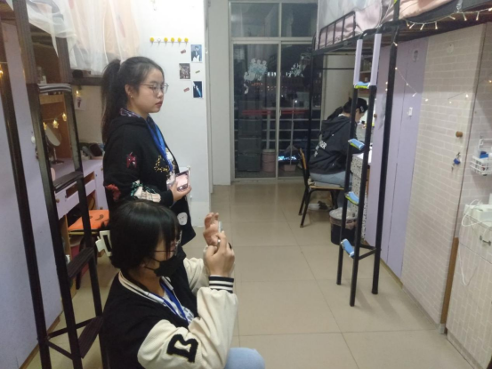 评选人员正在拍摄参赛寝室的书桌