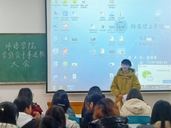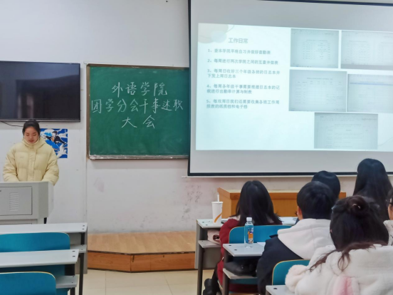 会上,团学分会主席团成员首先介绍了述职的内容和流程安排,随后各部门干事依次上台进行工作总结。干事们就本学期的工作内容,工作感受,工作反思以及未来计划作了详细的总结,同时也表达了对关心和鼓励他们的老师和同学的感谢。