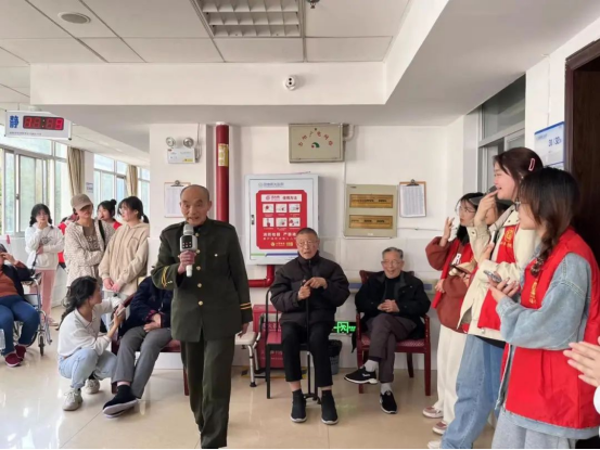 踏着春光,志愿者们来到了颐养院。迎接他们的是一位老爷爷的悠悠船歌,沧桑低沉却传情传义。