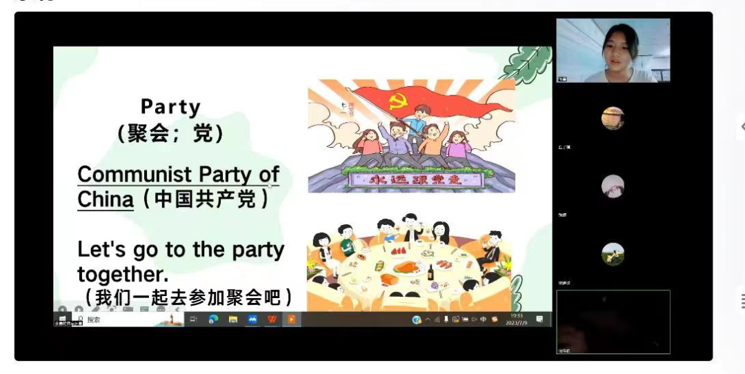 大班教学期间,志愿者开展了以中国红色文化为主题的英语剧本的教学。将剧本的重要内容精简成几页PPT,包括重点词汇、固定搭配、与课文的衔接以及有关于剧本和党史的视频短片。小朋友们在志愿者的带领下,学习党的历史,回望峥嵘岁月,深切感受到今天和平生活的来之不易,不断坚定理性信念,为将来担当时代责任做准备。