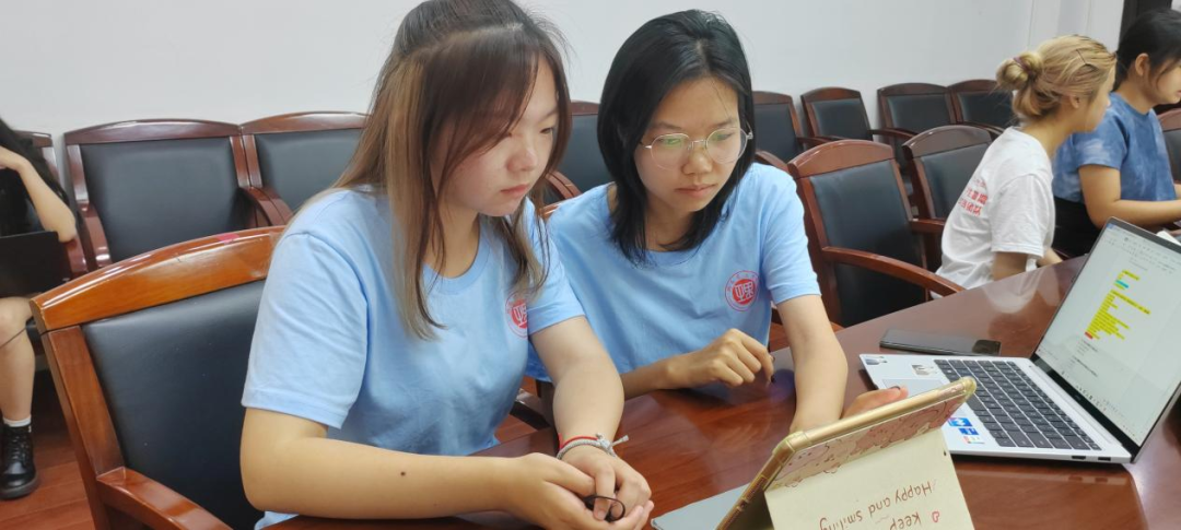 丁心奕和巫欣媛正在讨论问卷