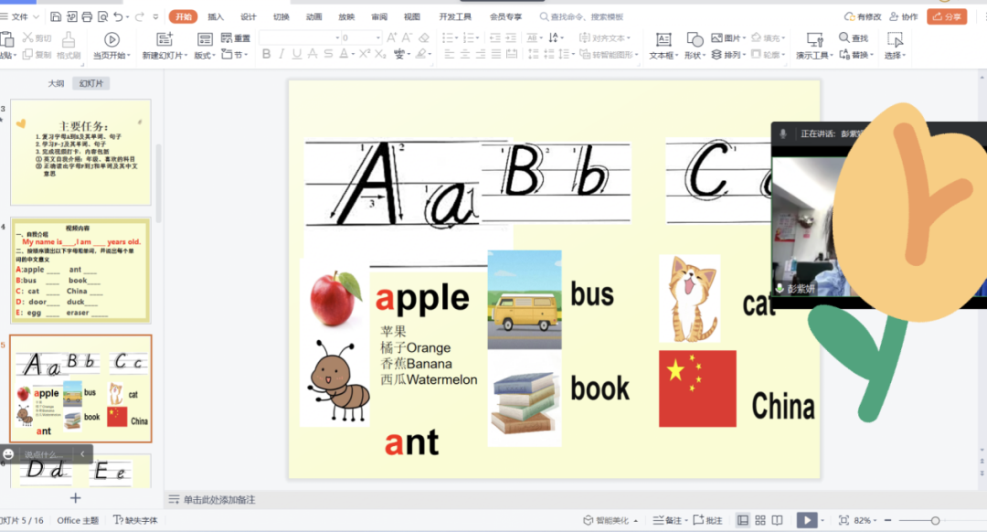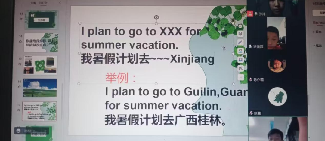 活动第二天于线上通过腾讯会议的形式进行,小班主要教学简单的字母F到J及其单词,大班的教学内容以“Plan of summer holiday”为主题。在志愿者们的耐心教导和家长的共同努力下,小班小朋友们顺利完成字母及单词学习任务并进行简单自我介绍视频打卡发至微信班群,大班小朋友们完成了有关暑假计划方面的问答及英文句子造句,志愿者们将上下课时间合理分配,课前精心制作授课内容,课后按时发放复习资料,并提供答疑服务。