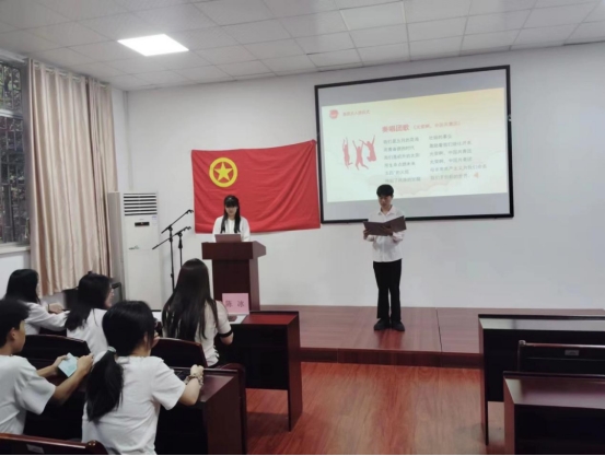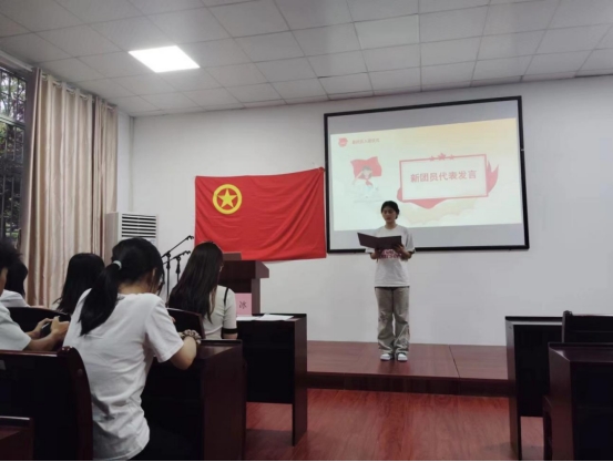 随后,主持人公布了本次新发展团员的名单,共有以黄忆为代表的8位新团员。接着,团委书记陈冰老师和老团员代表罗叶同学为新团员们颁发团员证并戴团徽。新团员们在团旗下庄严宣誓,承诺将遵守团的章程,执行团的决议,履行团员义务,严守团的纪律,勤奋学习,积极工作,吃苦在前,享受在后,为共产主义事业而奋斗。