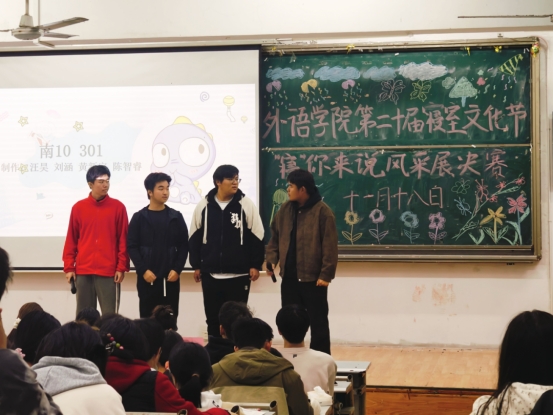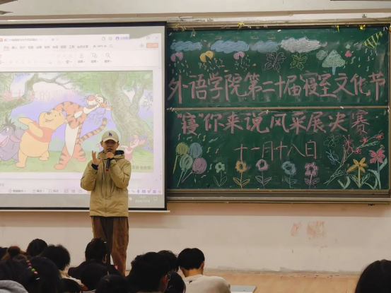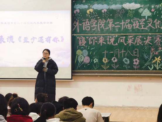 大赛中,参赛选手们依次上台展示各自寝室的独特风采。他们精心制作了PPT和Vlog,在背景音乐的映衬下,神采奕奕地讲述着独属于他们的寝室故事。这些故事或平凡,或新奇,或关于家乡,或关于未来,虽事殊人异,却个个深入人心,获得了现场观众的热烈掌声。有的选手还展示了自己的才艺,不断活跃着现场气氛,中场时歌曲《至少还有你》更是将现场的氛围推至高潮。