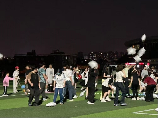 夜跑环节结束后,全体员工参与了激烈的枕头大战。哨声响起后,白色枕头如流星般在空中穿梭,参赛者们各出奇招,有人单膝跪地蓄力投掷,有人敏捷跃起拦截“飞来横枕”。现场气氛热烈,每个人脸上都洋溢着酣畅淋漓的笑意,汗水混着欢乐的气息弥漫在空气中。