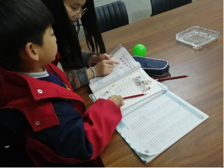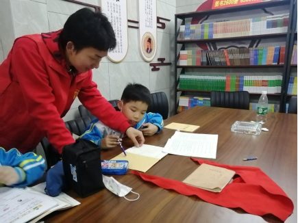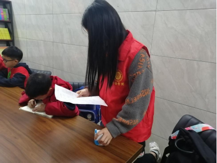 小朋友在志愿者的陪伴下进行默写