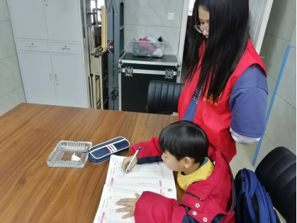 志愿者在陪伴小朋友练字