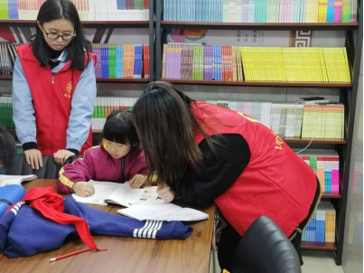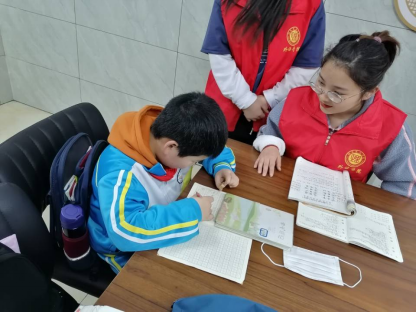志愿者在辅导小朋友阅读文章