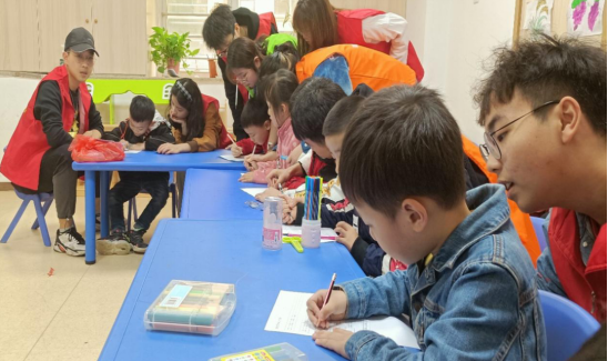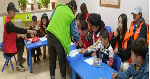 志愿者们正和小朋友们一块学习