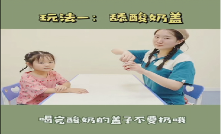 孩子们对食物的诱惑总是天然没有抵抗力的,于是志愿者们挑选了一个关于舔酸奶的口肌训练游戏:家长们通过沾有酸奶的酸奶盖引导孩子们伸出并且移动舌头,反复四次,能够锻炼孩子们的口腔肌肉以及提升孩子们舌头的灵活度。