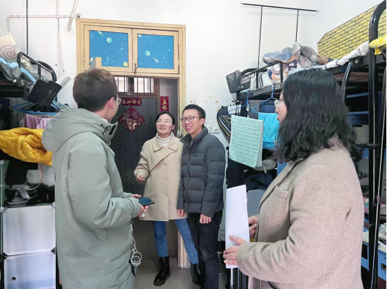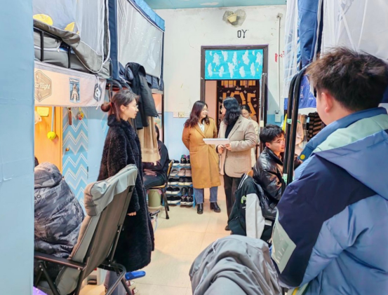 下寝过程中,老师们询问同学们的返校情况及开学准备,掌握同学们的思想动态和生活状况,嘱咐大家尽快适应返校后的环境和节奏,在宿舍要相互关心、相互帮助,共同营造良好的学习、生活环境。同时老师们也强调,疫情防控不容忽视,要保持干净的个人及宿舍卫生,并叮嘱和鼓励员工新的学期要有新的面貌,要以健康积极的心态投入新一学期的学习生活中去。