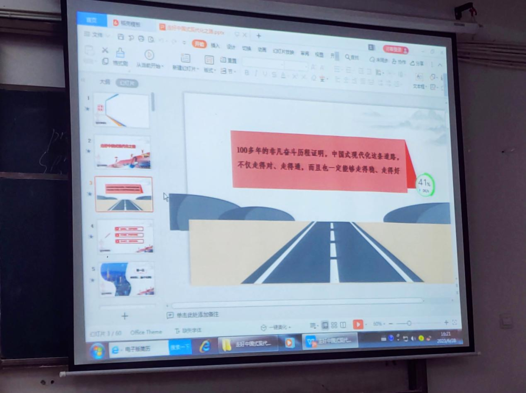 授课过程中,王敏给同学们播放了一段有关新中国时任总理周恩来的影片,影片呈现了新中国成立之初,百废俱兴,急需改革的情况。当时以毛泽东同志为党中央核心的领导班子,中央各部门负责人,为了国家社会的稳健发展,积极谋划有助于推动新中国发展的顶层设计,一系列法案法规,以及发展的具体规划也在正确的决策之下应运而生,几十年来,一代又一代中国人,为了巩固祖国政权,为推进伟大的社会主义建设事业而不断接续奋斗,呕心沥血。这些都为推进当今中国的现代化道路提供了基本参考和信心。