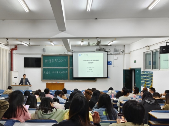 本次讲座主要针对英语专业八级翻译方面进行了培训。徐佐浩副教授对翻译考试的考纲要求、备考策略、翻译过程中的选词和句子结构处理等方面进行了详细讲解。在备考策略方面,徐佐浩副教授提出,同学们需要重视词汇的积累量,培养跨文化意识,同时掌握基本的翻译理论和技巧。在翻译的选词和句子结构处理方面,徐佐浩围绕具体题型进行阐述总结,带领同学们进行真题演练,对技巧和要点进行分析应用,为同学们提供了切实有效的方法策略,规避做题过程中常出现的错误。