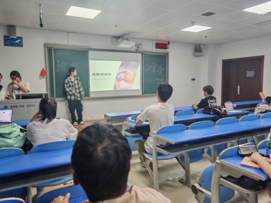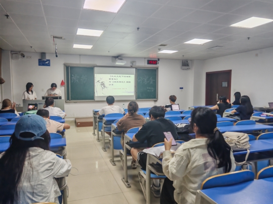 分享会上,外院学子以多元视角展开深度交流。首位分享者围绕《沈从文笔下的湘西萧萧集》,从少女萧萧的命运切入,剖析沈从文笔下湘西社会的伦理变迁与人性温度。细腻的文字带领听众漫步于湘西村落,感受传统乡土文化中质朴而坚韧的生命力。随后,另一学子以《洞庭湖志》为引,通过梳理洞庭湖的水文地理变迁与民俗掌故,解码湖湘生态人文密码,并呼吁增强对历史文化遗产的保护意识。