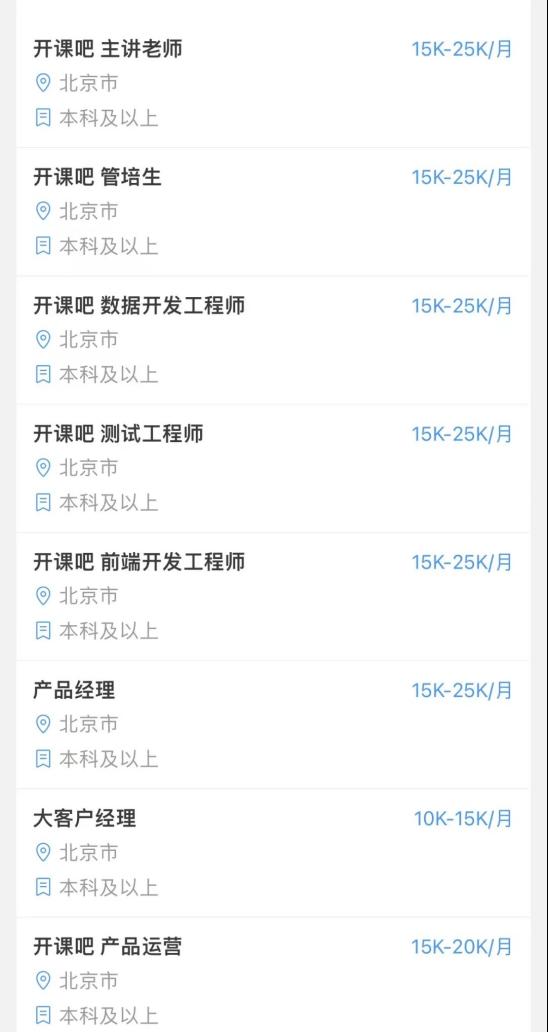(1) 北京:管培生、主讲老师、Java开发工程师、前端开发工程师、测试工程师、产品经理、产品运营、数据开发工程师、大客户经理