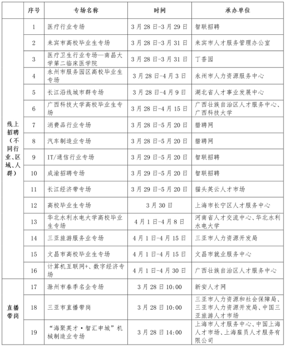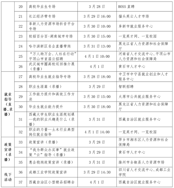 线上活动35场,包括医疗卫生行业、消费品行业、汽车制造业、IT/通信行业、旅游服务业、长江经济带等16场线上专场招聘会,10场直播带岗以及职业生涯规划、工作能力提升和高效工作方法、惠企稳岗政策宣讲等9场就业指导和政策宣讲直播(录播)课。线下活动2场,分别是举办西藏自治区小型精品招聘会和成都工业公司政策宣讲。高校毕业生和用人单位可通过中国国家人才网大中城市联合招聘活动主会场页面(http://dzcs.newjobs.com.cn/),或在微信小程序中搜索“全国高校毕业生精准招聘”平台查询相关信息并参与各类专场服务活动。
