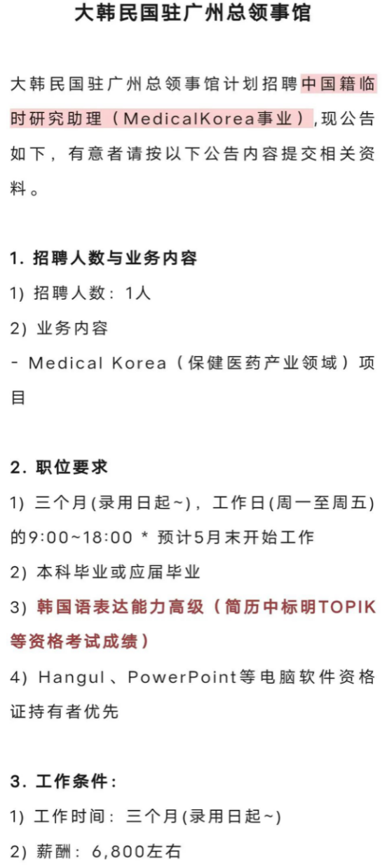 韩国驻广州总领事馆招聘中国籍助理