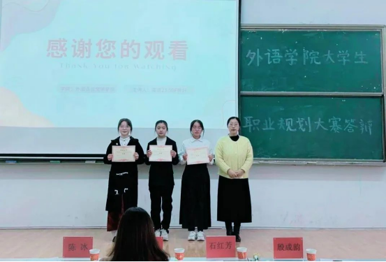 本次比赛分为主题陈述和评委提问两个环节。在第一个环节,参赛选手以PPT的形式,从自我评价、职业定位、职业规划和评估调整等部分进行演讲展示。随后,评委结合选手陈述和现场表现进行提问。经评委打分统计后,比赛结果随之公布。获得一等奖的选手有:易晓蕾、严意媛、丁心奕和吴茜;获得二等奖的选手有:巫欣媛、刘思梅和卢俊杰;获得三等奖的选手有:郭蕾、叶蕊、周依婷和黄好。
