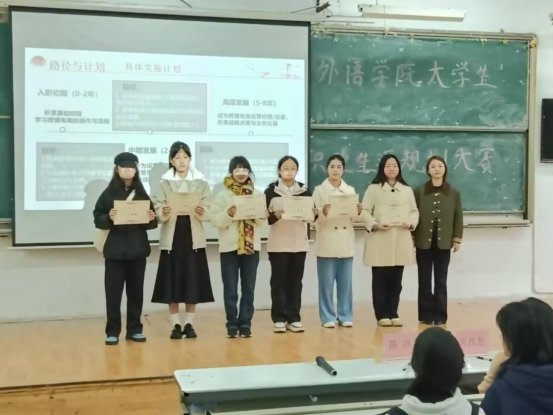 本次老员工职业规划大赛分为成长与就业两个赛道,均由各自赛道的参赛选手进行评述,最后由主持人集中公布获奖情况。在选手评述环节,参赛选手以PPT的形式,从自我介绍、职业定位、职业规划和评估调整等部分进行演讲展示。随后,评委结合参赛选手的表现进行打分并由主持人公布比赛具体获奖情况。经评委打分统计后,成长赛道获得一等奖的选手有:丁心奕;获得二等奖的选手有:刘思梅、王紫烨;获得三等级的选手有:刘程婉林、李雨乐、王思蕴。就业赛道获得一等奖的选手有:杨皓迪;获得二等奖的选手有:莫杨阳;获得三等奖的选手有:黄好、文凯。