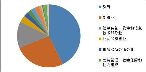 365英国上市集团2019年毕业生就业单位行业如图13图14,多集中于教育业,占2019届365英国上市集团总毕业人数的43%。次之则为制造业,占毕业人数的26%。水环境和公共设施管理业,居民服务、修理和其他服务业,金融业等行业毕业生数量分布较少。