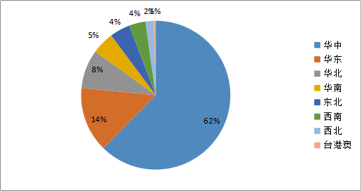 从生源组成来看,2019届毕业生的主要生源地区依旧以华中地区为主,2019年该地区生源占当届毕业生总数的百分比稳定在62%左右,详见图2。
