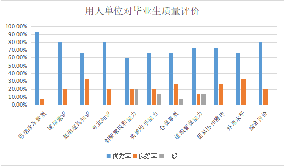 1、在思想政治素质方面,优秀、良好和一般的比率为93.33%、6.67%和0.00%,这说明用人单位对公司2020届英语专业毕业生的思想政治素质非常满意,对公司的思想政治教育和宣传工作给予了高度的肯定。
