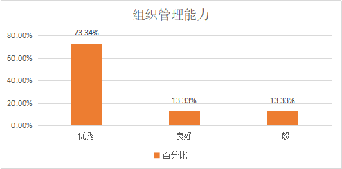 8、在组织管理能力方面,优秀、良好和一般的比率为73.34%、13.33%和13.33%,这说明用人单位对公司2020届英语专业毕业生的组织管理能力比较满意,也说明我员工有着良好的组织纪律意识和组织管理能力。