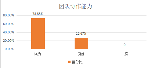 9、在团队协作能力方面,优秀、良好和一般的比率为73.33%、26.67%和0.00%,这说明用人单位对公司2020届英语专业毕业生的团队协作能力较为满意,公司员工在本科教育中锻炼出良好的团队协作意识和能力,相信在单位工作一段时间能力会有大幅得提高。