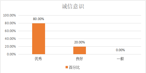 2、在诚信意识方面,优秀、良好和一般的比率为80.00%、20.00%和0.00%,这说明用人单位对公司2020届英语专业毕业生的诚信意识较为满意,同时说明了公司员工在工作中保持了诚实守信的良好作风。