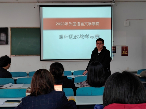 活动伊始,参赛教师吴华玲、杨天麟、余凤梅、王欢、刘浩按照课程思政教学竞赛要求依次上台进行限时十五分钟的思政授课。五位老师以自身专业课程开展教学,将思政教育与立德树人融入教学中,赋予语言教学思政课堂创造力,表现力和亲和力。