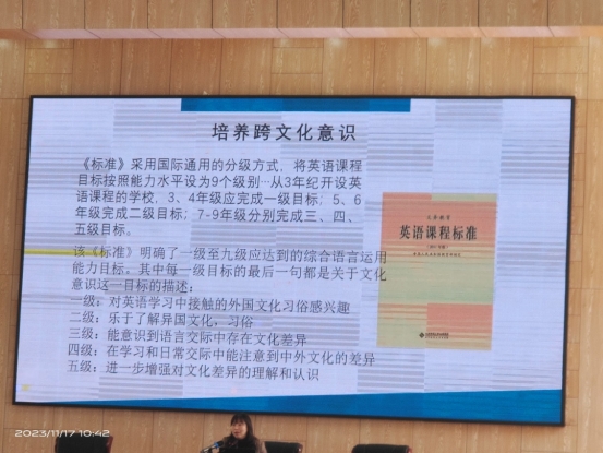 邹娟娟教授讲述了 “基于英语课程质量标准——浅谈新时代中小学英语教学”这一课题。邹娟娟教授也对中小学英语教学中的课程思政、中小学英语教师的学科素养和职业素养,以及义务教育英语课程标准解读学习进行了讲解,并针对如何培养员工跨文化意识这一点分享了她宝贵的经验。她强调要强化对教师思想政治和师德师风的建设工作,让团队队伍数量、质量和结构不断优化,提升地方教学质量,以教育之强服务地方经济社会高质量发展。整场讲座内容丰富,教师们边听边记录讲座内容,讲座结束后他们纷纷表示受益匪浅。
