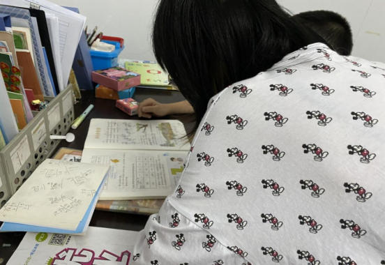 志愿者认真辅导小朋友作业