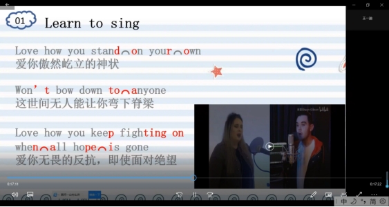 下午,结合当下形势和时代潮流,志愿者选择了《孤勇者》英文版歌曲的高潮部分,进行口语连读、爆破、弱化等发音知识的教学,以脍炙人口的歌曲的形式开展英语学习,课堂生动,有助于集中注意力和调动小朋友的学习积极性。