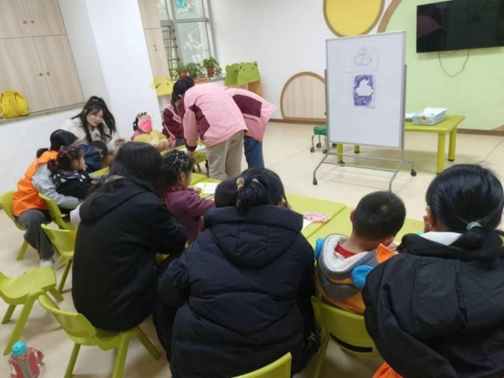 三组志愿者陪伴孩子们上手工课。在志愿者和老师的帮助下,孩子们用颜料完成拓画。志愿者称:这是一次收获满满的志愿活动。