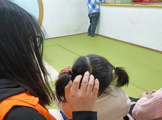 一组志愿者来到孩子们午睡的地方,帮助他们穿衣服和扎辫子。孩子们安静有序,开启了下午的课程。跳舞、游戏、吃零食,志愿者投入其中,与孩子们共度美好时光。