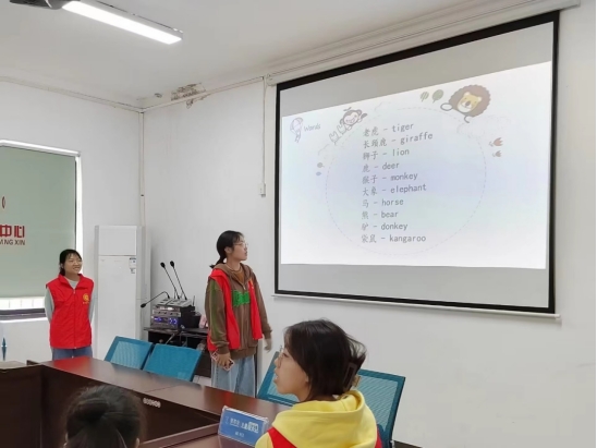 志愿者在教授小朋友们动物相关的英语单词