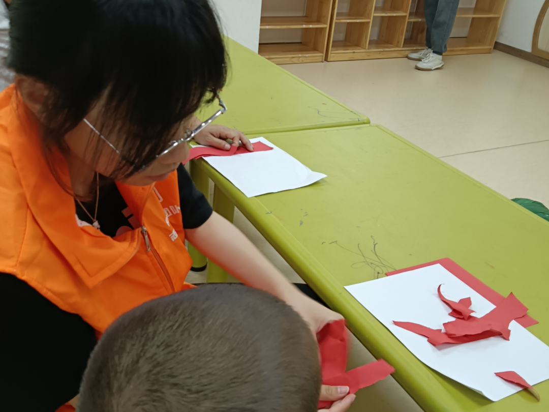 志愿者和小朋友剪纸