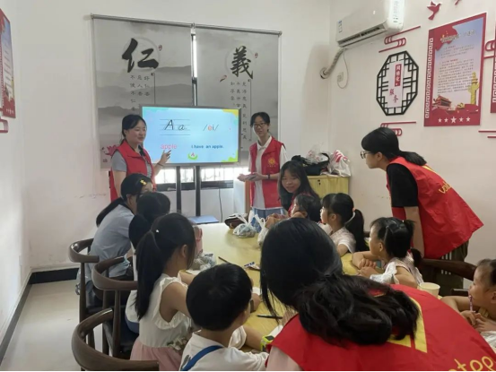 志愿者们在教授小朋友们英文字母