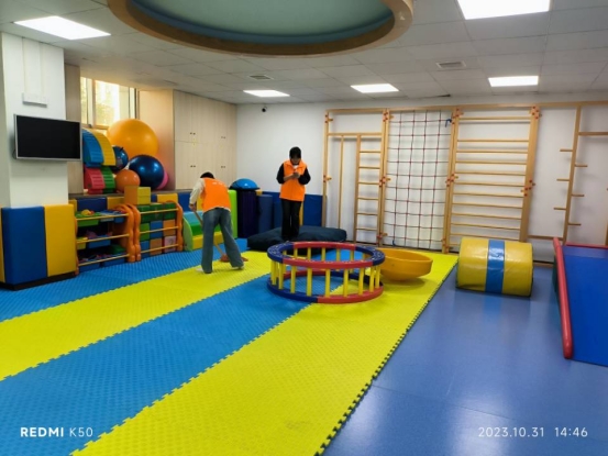 第二组志愿者分工配合,擦器材、拖地、铺地,高效完成打扫任务。志愿者又与小朋友开展趣味体育活动,接力跑步、跳圈圈,志愿者积极投入,小朋友兴趣高涨。