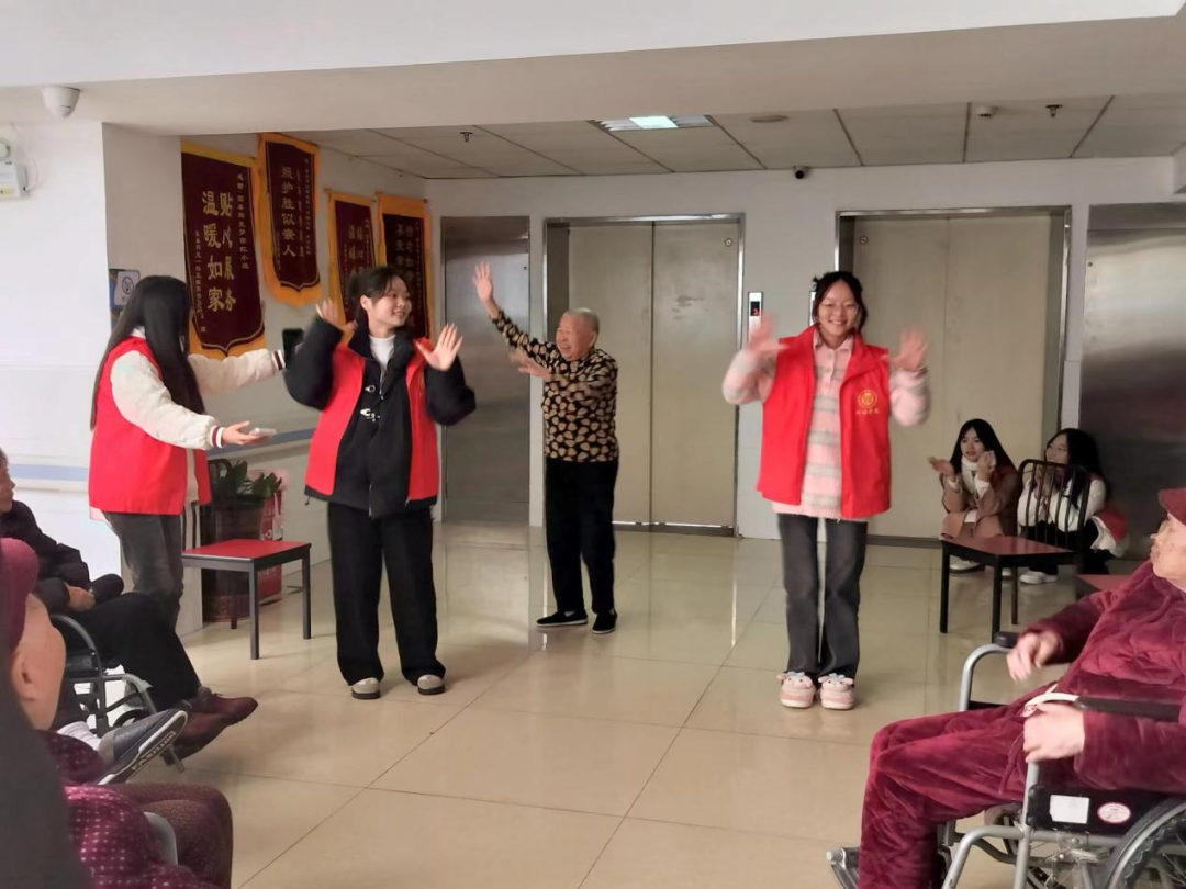 微风不燥,阳光正好。志愿者们踏着轻快的步伐走进颐养院,将温暖与爱传递。细心安放好座椅后,志愿者们搀扶着爷爷奶奶入座,表演正式开始。欢快的乐声倾泻而出,志愿者们合着伴奏唱歌舞蹈,灵动活泼的舞姿尽显青春活力。老红歌,手势舞,各种节目接踵而至。一位老奶奶还主动加入志愿者们的行列,跟着观众们的节拍起舞,快乐气氛渐浓,笑容洋溢在每个人的脸上。