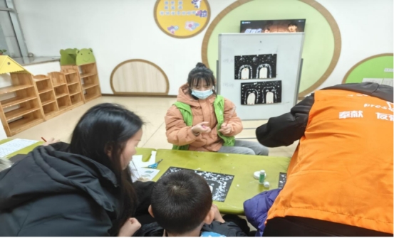 志愿者辅导小朋友画耳罩